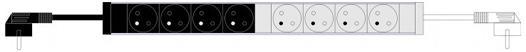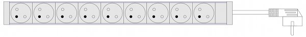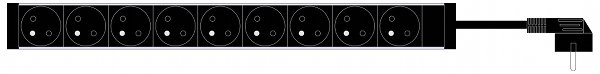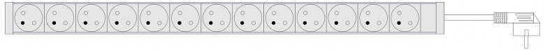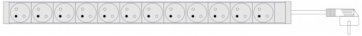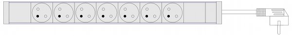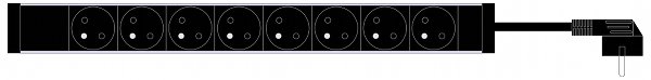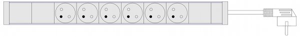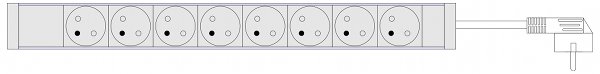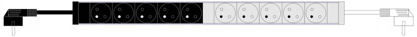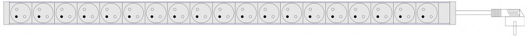 Socket 45° oriented with child-protection. Plastic elements colour: light-grey similar to RAL7035 or black similar to RAL9005. Natural anodized aluminium body. Dimension without mounting brackets WxHxD: 431x44x44mm. Vertical or horizontal mounting in 19” rack - 1U. Mounting brackets for installation in 4 orientations. Supply cable H05VVF.3G1,5mm² in white or black colour terminated unischuko angled plug. Standard length up to 10m. Maximum current 16A (3 680 W). Mains voltage 230 VAC Protection level IP20. Declaration of Conformity CE.