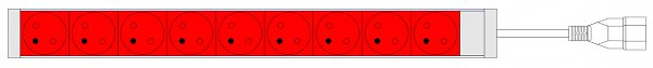 Socket 45° oriented with child-protection. Plastic elements colour: light-grey similar to RAL7035 or black similar to RAL9005 or red similar to RAL3002. Natural anodized aluminium body. Dimension without mounting brackets WxHxD: 431x44x44mm. Vertical or horizontal mounting in 19” rack - 1U. Mounting brackets for installation in 4 orientations. Supply cable H05VVF.3G1,0mm² in white or black colour terminated IEC320C14 plug. Standard length up to 10m. Maximum current 10A (2300 W). Mains voltage 230 VAC. Protection level IP20. Declaration of Conformity CE.