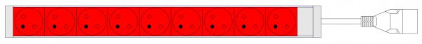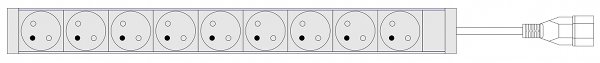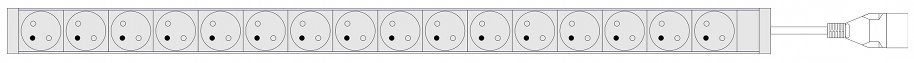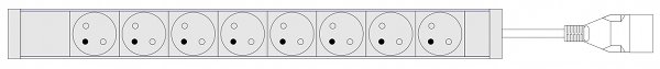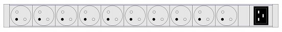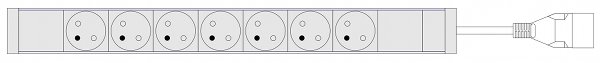 Socket 45° oriented with child-protection. Plastic elements colour: light-grey similar to RAL7035 or black similar to RAL9005. Natural anodized aluminium body. Dimension without mounting brackets WxHxD: 431x44x44mm. Vertical or horizontal mounting in 19” rack - 1U. Mounting brackets for installation in 4 orientations. Supply socket IEC320C20 16A/230VAC (strip supplied without power cord). Maximum current 16A (3 680 W). Mains voltage 230 VAC Protection level IP20. Declaration of Conformity CE.