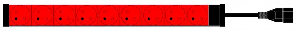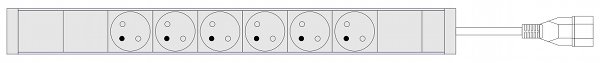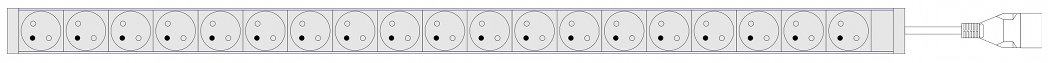 Socket 45° oriented with child-protection. Plastic elements colour: light-grey similar to RAL7035 or black similar to RAL9005 or red similar to RAL3002. Natural anodized aluminium body. Dimension without mounting brackets WxHxD: 431x44x44mm. Vertical or horizontal mounting in 19” rack - 1U. Mounting brackets for installation in 4 orientations. Supply cable H05VVF.3G1,5mm² in white or black colour terminated IEC320C20 plug. Standard length up to 10m. Maximum current 16A (3 680 W). Mains voltage 230 VAC Protection level IP20. Declaration of Conformity CE.