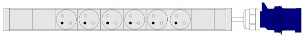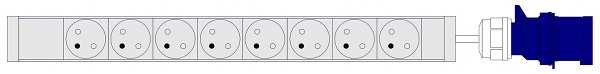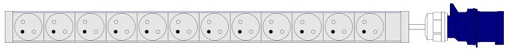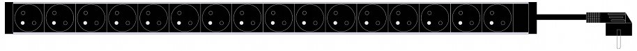 Socket 45° oriented with child-protection. Plastic elements colour: light-grey similar to RAL7035 or black similar to RAL9005. Natural anodized aluminium body. Dimension without mounting brackets WxHxD: 431x44x44mm. Vertical or horizontal mounting in 19” rack - 1U. Mounting brackets for installation in 4 orientations. Supply cable H05VVF.3G1,5mm² in white or black colour terminated IEC60309 plug blue 1-phase 16A/230VAC. Standard length up to 10m. Maximum current 16A (3 680 W). Mains voltage 230 VAC Protection level IP20. Declaration of Conformity CE.