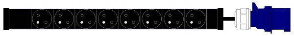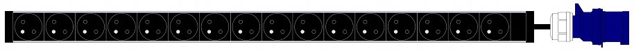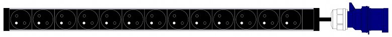 Vertical mounting in 19” rack.Mounting brackets for installation in 4 orientations. Supply cable H05VVF.3G1,5mm² in white or black colour terminated IEC60309 plug blue 1-phase 16A/230VAC. Standard length up to 10m. Maximum current 16A (3 680 W). Mains voltage 230 VAC Protection level IP20. Declaration of Conformity CE.